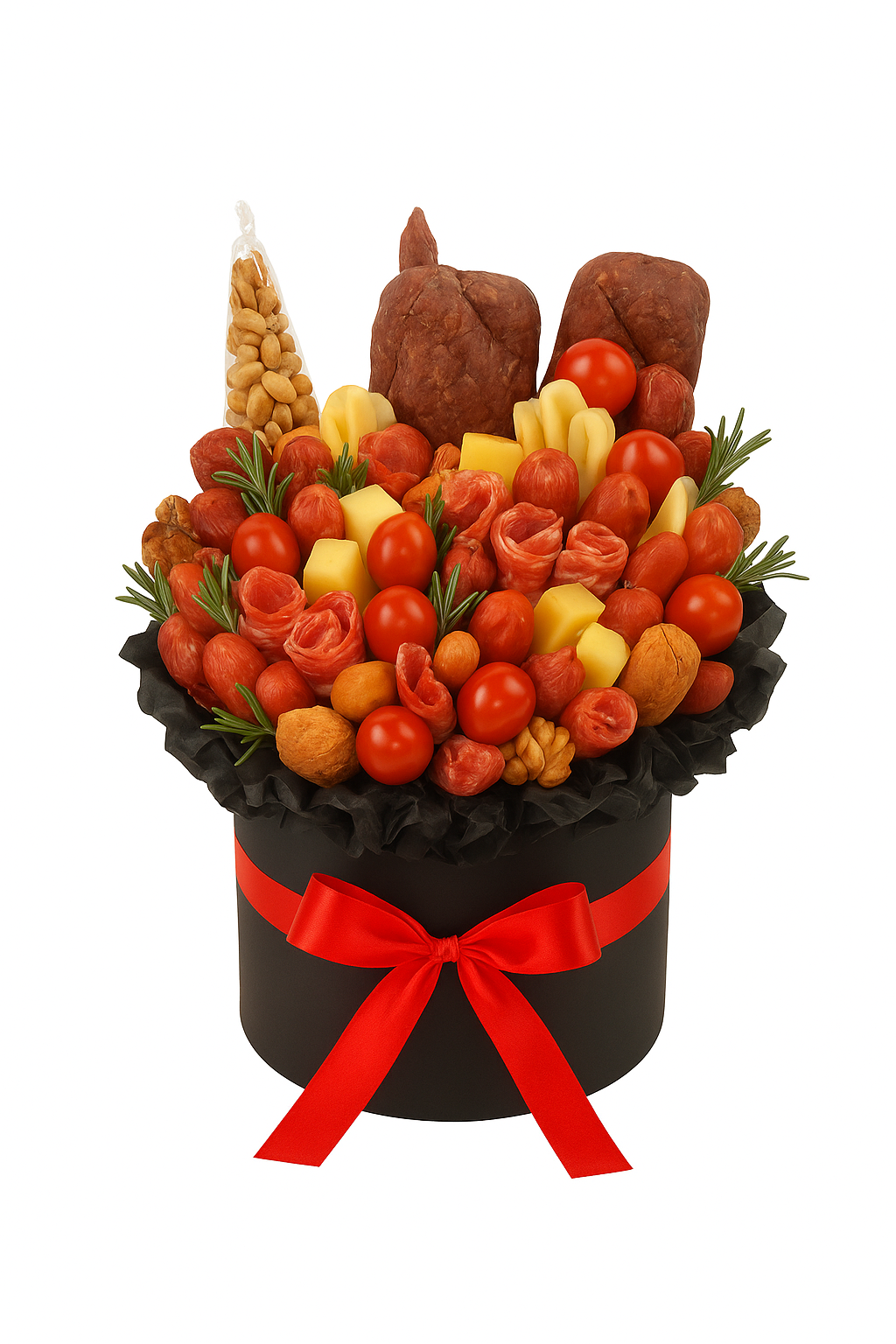 Ši išskirtinė užkandžių puokštė – puiki dovana tikram gurmanui! Sudėta iš kruopščiai atrinktų delikatesų: vytintų dešrelių, įvairių rūšių sūrių, duonos lazdelių, šviežių bagetų, riešutų, džiovintų vaisių, rozmarino šakelių ir aštriųjų pipirų. Viskas elegantiškai supakuota į juodą matinį popierių ir perrišta raudona juostele – stilingas, skonio pilnas siurprizas bet kokiai progai.
